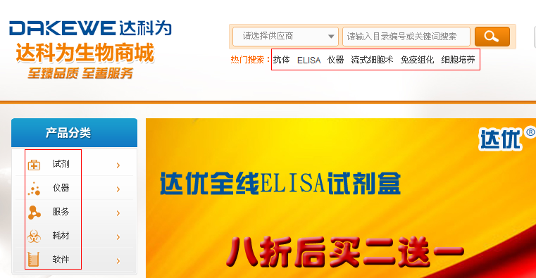 在生物城首頁可以點(diǎn)擊“產(chǎn)品目錄”,或者進(jìn)入生物商城,通過分類或者搜索來查找產(chǎn)品