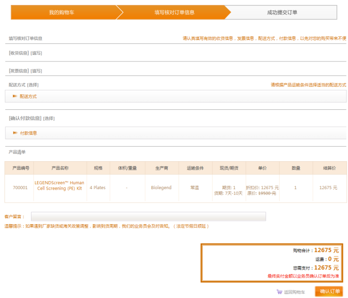 點(diǎn)擊購物車頁面的“結(jié)算”進(jìn)入填寫訂單信息的頁面,在此頁面請認(rèn)真填寫,收貨地址、發(fā)票信息、配送方式、支付方式等信息。點(diǎn)擊“確認(rèn)訂單”即可生成訂單。