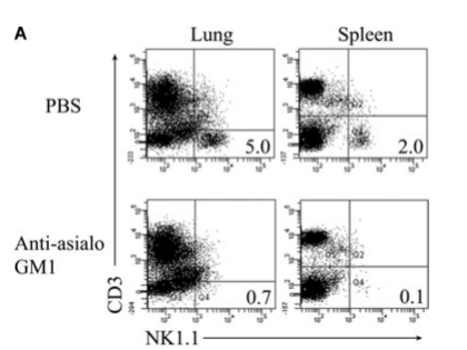 文獻(xiàn)來(lái)源:Zhou G, et al. 2013. Eur. J. Immunol. 43:929. 該圖顯示尾靜肪注射anti-asialo GM1PBS,每五天一次,不管是肺還是脾臟,都顯示出NK細(xì)胞消耗率。