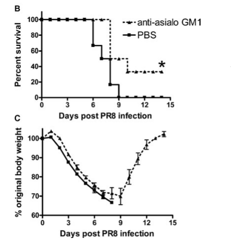 文獻(xiàn)來(lái)源:Zhou G, et al. 2013. Eur. J. Immunol. 43:929. 該圖顯示尾靜肪注射anti-asialo GM1PBS,同時(shí)用流感病毒處理,并且每天監(jiān)測(cè)小鼠存活率(B)和小鼠體重(C)。顯示,消耗NK細(xì)胞增加流感病毒感染小鼠的致病率和致死率。