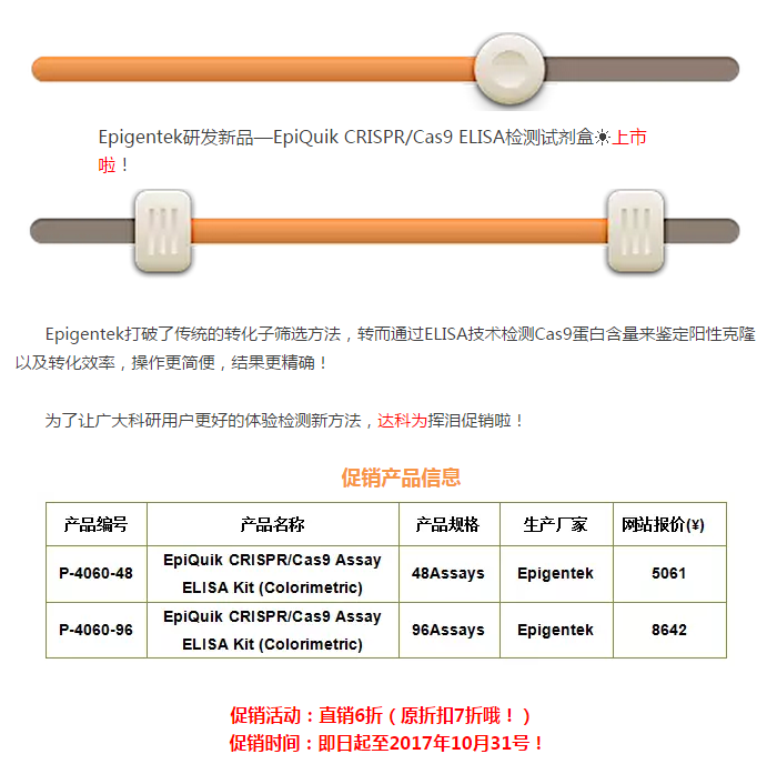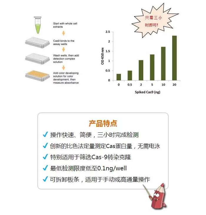 傳統(tǒng)方法操作復雜、花費大量時間與精力,針對這個特點,Epigentek研發(fā)出了通過ELISA檢測Cas9蛋白含量,進而篩選轉化子的檢測試劑盒。該試劑盒僅需要純化的Cas9 核酸酶和全細胞提取物(分離自各物種的組織和培養(yǎng)的細胞),就能夠特異性定量檢測CRISPR相關蛋白9(Cas9,dCas9)。