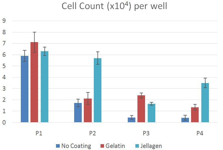 Jellagen膠原蛋白不僅具有良好的細(xì)胞兼容性、細(xì)胞粘附性,還可以為細(xì)胞提供充分的營(yíng)養(yǎng)。在基質(zhì)支持軟骨細(xì)胞生長(zhǎng)過(guò)程中,Jellagen膠原上生長(zhǎng)的軟骨細(xì)胞同在牛明膠上生長(zhǎng)的軟骨細(xì)胞比較,細(xì)胞在P4時(shí)存活率更高。