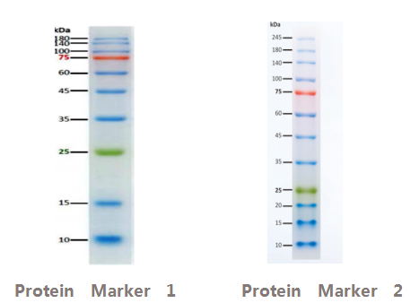BioSciTM ColorBandTM Prestained Protein Marker  是一種三色預(yù)染的即用型蛋白分子量標(biāo)準(zhǔn)品,包括十種分子量從的預(yù)染重組蛋白,經(jīng)SDS-PAGE凝膠電泳或轉(zhuǎn)膜后可觀察到清晰的彩色蛋白條帶,其中25KD為綠色條帶,75KD為紅色條帶,其余條均為藍(lán)色條帶。