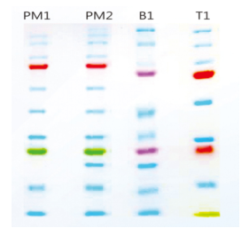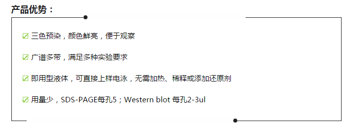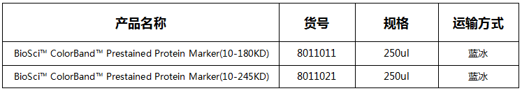BioSciTM ColorBandTM Prestained Protein Marker產(chǎn)品應(yīng)用于SDS-PAGE凝膠電泳時,可實時監(jiān)測蛋白樣品的分離情況,也可以用于評估Western轉(zhuǎn)膜(PVDF、尼龍或硝酸纖維素膜)效率,并粗略的估計蛋白樣品的分子量。
