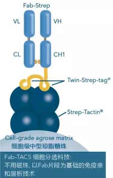 以Fab片段為基礎的無痕親和細胞分選技術(traceless affinity cell selection, Fab-TACS),由IBA Lifesciences根據(jù)其獨家的Strep-tag?/Strep-Tactin?蛋白純化系統(tǒng)發(fā)展而來。Fab-TACS運用免疫親和層析的原理,利用細胞表面抗原分子CD marker與Fab片段的特異性結(jié)合來進行捕捉及釋放目標細胞。以不具磁性且可逆的試劑,取代一般具高親和力的完整抗體, 直接由全血或其他血液樣本來進行溫和的標準化分選,因此能精準的提供您不含標記、未被活化的目標細胞。