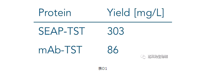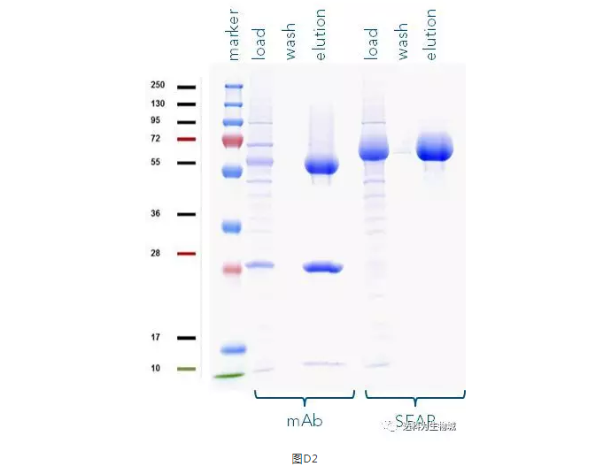 除了上述實(shí)驗(yàn)所用的CHO細(xì)胞株外(中國(guó)倉(cāng)鼠卵巢細(xì)胞),另一常用于生產(chǎn)蛋白的哺乳動(dòng)物細(xì)胞株為HEK293(人胚胎腎細(xì)胞),使用上較CHO簡(jiǎn)單。我們測(cè)試了Strep-Tactin?XT的純化表現(xiàn):表D1為以Expi293表達(dá)SEAP-TST或mAb-TST蛋白后,目標(biāo)蛋白的濃度。圖D2為純化表現(xiàn)的SDS-PAGE分析。從中可知,與ExpiCHO培養(yǎng)基相同,直接將表達(dá)好的Expi293上清加入1ml Strep-Tactin?XT高載量重力柱中進(jìn)行純化,一樣能夠快速的得到高純度的目標(biāo)蛋白。