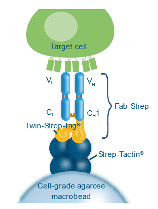 Fab-TACS柱子填充了包被有Strep-Tactin? 多聚體的細(xì)胞級(jí)瓊脂糖基質(zhì),偶聯(lián)上Strep-tag的Fab片段(Fab-Streps)特異性的結(jié)合到瓊脂糖基質(zhì)上。隨后,加入全血或其他血液制劑流過(guò)柱子。目的細(xì)胞通過(guò)特異性的與Fab-Streps作用從而結(jié)合到瓊脂糖基質(zhì)上,其他非目的細(xì)胞則有效的被洗去。最后,加入生物素使目的細(xì)胞從Fab-Streps上解離。至此,就已分離得到不帶任何標(biāo)記的、真實(shí)的目的細(xì)胞可用于下游的實(shí)驗(yàn)研究。