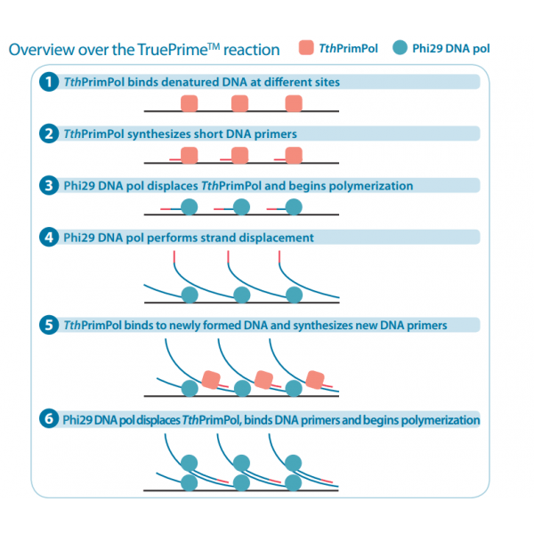 TruePrime?采用MDA技術(shù),基于新型的TthPrimPol 引物酶和Phi29 DNA聚合酶,擴增過程無需添加隨機引物,減少了擴增偏倚,提高了擴增過程的覆蓋率和保真性,并且對于污染的外源DNA不敏感,可重復(fù)性好。TruePrime?可用于單個細(xì)胞或少量細(xì)胞的全基因組擴增,與常見的NGS平臺如Illumina和IonTorrent等兼容性良好。