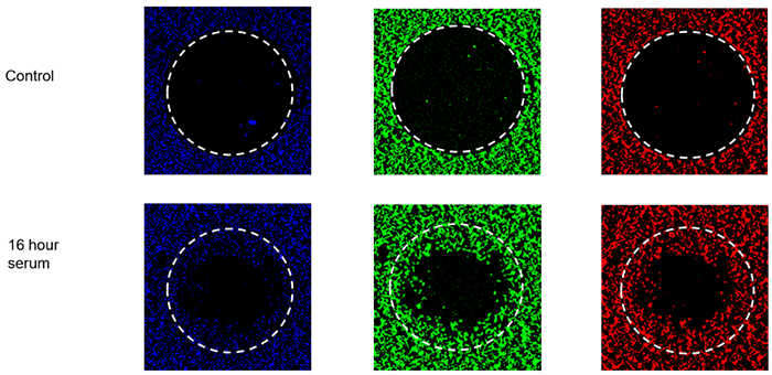 細(xì)胞排斥區(qū)分析(間隙封閉法)是Platypus公司獲得專利的技術(shù)。讓細(xì)胞在孔的底部圍繞一個(gè)阻止細(xì)胞生長(zhǎng)的區(qū)域(如在孔底部中央放置阻塞物)生長(zhǎng),實(shí)驗(yàn)在移除阻塞物后開始,可觀察單層細(xì)胞遷移到原先的空白區(qū)域中。