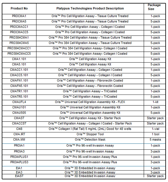 美國(guó)Platypus Technologies公司建立于2000年,是細(xì)胞分析領(lǐng)域產(chǎn)品的耗材供應(yīng)商,熱賣產(chǎn)品為OrisTM和OrisTM Pro系列細(xì)胞遷移和侵襲實(shí)驗(yàn)試劑盒。其開發(fā)的用于檢測(cè)細(xì)胞遷移和侵襲的細(xì)胞排斥區(qū)分析法,克服了Transwell和劃痕實(shí)驗(yàn)的缺點(diǎn)。
