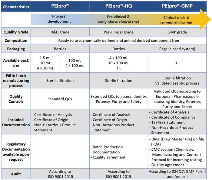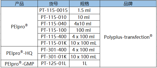 表1.Polyplus-transfection?提供一系列不同級別PEIpro?,滿足從工藝開發(fā)、臨床前、到臨床級別病毒載體的生產(chǎn)需求