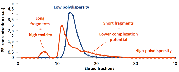 由于長片段的PEI對細胞有毒性,而短片段PEI結(jié)合DNA能力較差(見紅色),所以優(yōu)化PEI的片段大小,降低其分散性能減少細胞毒性,同時增加結(jié)合DNA的能力(見藍色)和轉(zhuǎn)染重復性。