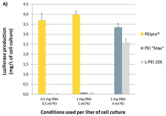 懸浮HEK-293以1×106cells/mL的密度接種在無血清培養(yǎng)基中,使用重懸后濃度為1 mg/mL的PEIpro?、PEI “Max” 和L-PEI 25 kDa (Polysciences, Warrington, PA)進行轉(zhuǎn)染。采用常規(guī)熒光素酶測定法在轉(zhuǎn)染后48h測定熒光素酶的表達