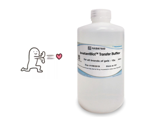 當然蛋白電泳只是WB實驗的第一步,那還有什么方法能加快后續(xù)實驗(如轉(zhuǎn)膜)進程呢?別急,今天就給大家介紹一款來自分子產(chǎn)品專家Expedeon公司的快速轉(zhuǎn)膜液——InstantBlot?Transfer Buffer(貨號:NXB87500),作為Expedeon的一款專利產(chǎn)品,該轉(zhuǎn)膜液能夠大幅提升蛋白從“膠”至“膜”的轉(zhuǎn)移速度,最快只需10 min即可完成轉(zhuǎn)膜,并且不會產(chǎn)生過多的熱量,避免影響蛋白的后續(xù)檢測。