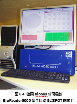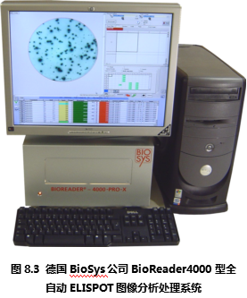 德國(guó)Bio-Sys公司從上世紀(jì)80年代開(kāi)始就致力于生物圖像識(shí)別領(lǐng)域,在進(jìn)入ELISPOT圖像分析儀市場(chǎng)后一直以其先進(jìn)的ELISPOT斑點(diǎn)識(shí)別技術(shù)聞名。德國(guó)Bio-Sys公司首先解決了顯微攝像系統(tǒng)難以定位96孔板上的每一個(gè)孔的問(wèn)題。其解決方法基于圖像識(shí)別技術(shù),利用板孔邊壁和真正的孔底的細(xì)微差別,在機(jī)械定位的基礎(chǔ)上,通過(guò)軟件識(shí)別來(lái)進(jìn)一步提高每孔的定位精度。是目前市場(chǎng)上所有ELISPOT圖像分析儀中唯一能夠完整識(shí)別整個(gè)孔底ELISPOT斑點(diǎn)圖像的設(shè)備。在對(duì)真假斑點(diǎn)的分辨中,德國(guó)Bio-Sys公司除了具備完善的物理學(xué)多參數(shù)識(shí)別技術(shù),還特別針對(duì)ELISPOT斑點(diǎn)形成的生物學(xué)過(guò)程,通過(guò)細(xì)胞因子顯色后的“光密度”峰值積分分析方法,精確分辨真假斑點(diǎn)、融合斑點(diǎn)等復(fù)雜情況。Bioreader系列ELISPOT圖像分析儀國(guó)外大多數(shù)較有經(jīng)驗(yàn)的ELISPOT實(shí)驗(yàn)室推崇的特點(diǎn)為:專(zhuān)業(yè)性和參數(shù)全開(kāi)放性。因?yàn)镋LISPOT實(shí)驗(yàn)的復(fù)雜性,ELISPOT斑點(diǎn)形成在不同的實(shí)驗(yàn)條件下有非常大的差異。這就對(duì)ELISPOT圖像分析儀提出了較高的要求:既要能夠保證斑點(diǎn)計(jì)數(shù)的真實(shí)性和一致性,又要能夠根據(jù)不同情況,通過(guò)實(shí)驗(yàn)者的判斷來(lái)校正儀器對(duì)ELISPOT斑點(diǎn)識(shí)別的標(biāo)準(zhǔn)。要同時(shí)實(shí)現(xiàn)以上兩個(gè)要求,唯一的辦法是將儀器的所有判斷標(biāo)準(zhǔn)向ELISPOT實(shí)驗(yàn)者開(kāi)放,實(shí)現(xiàn)實(shí)驗(yàn)者和儀器的互動(dòng)。在這一方面,德國(guó)Bio-Sys公司始終走在ELISPOT斑點(diǎn)識(shí)別領(lǐng)域的前列,新的Bioreader-4000型(圖8.3)和Bioreader -5000(圖8.4) 型在專(zhuān)業(yè)性和適用性方面都領(lǐng)先于其他廠(chǎng)家的設(shè)備。