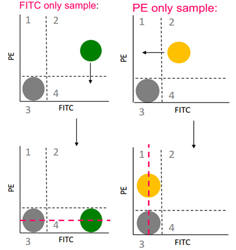 對(duì)于熒光補(bǔ)償?shù)拇_定,需運(yùn)用以上補(bǔ)償?shù)幕驹聿⒔Y(jié)合特定的標(biāo)本來實(shí)現(xiàn)。以FITC,PE雙色分析為例: