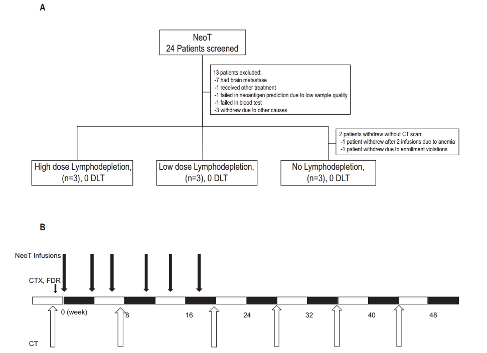 針對這些問題,中山大學(xué)徐瑞華團(tuán)隊(duì)在2023年6月10日發(fā)表了題為“A pilot study of lymphodepletion intensity for peripheral blood mononuclear cell-derived neoantigen-specific CD8+ T cell therapy in patients with advanced solid tumors”的研究論文。該研究開發(fā)了一種從癌癥患者的外周血單個(gè)核細(xì)胞(PBMCs)中產(chǎn)生個(gè)性化Neo-T(新抗原特異性CD8+ T細(xì)胞)的方法。作者建立了一個(gè)流程,包括通過生物信息學(xué)分析預(yù)測新抗原,并在25天內(nèi)大規(guī)模擴(kuò)增新抗原特異性T細(xì)胞。為了評估Neo-T治療的臨床療效并確定Neo-T治療的最佳淋巴細(xì)胞耗竭強(qiáng)度,作者進(jìn)行了一項(xiàng)首次在人體中使用氟達(dá)拉濱和環(huán)磷酰胺增加劑量的Neo-T治療的研究。該研究是一項(xiàng)開放標(biāo)簽I期臨床試驗(yàn)(NCT02959905),包括標(biāo)準(zhǔn)治療難治的局部晚期或轉(zhuǎn)移性實(shí)體瘤患者。