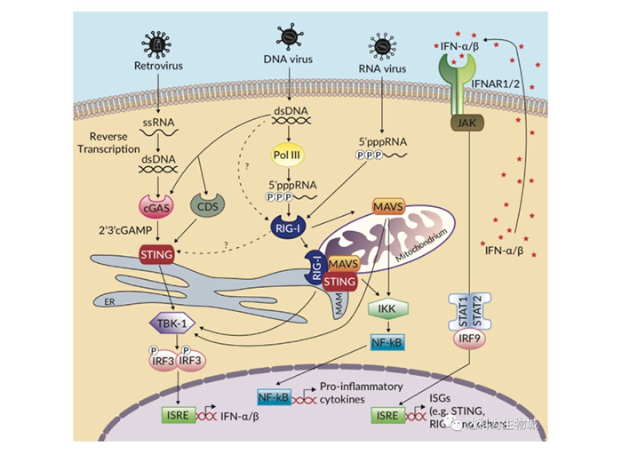 感受器cGAS和RIG-I通過單獨的接頭蛋白來識別不同的核酸和信號。cGAS感受細(xì)胞質(zhì)中異常DNA的存在和濃度,而后通過環(huán)二核苷酸2’3’-cGAMP[2]募集干擾素基因刺激因子(STING, or MITA/ERIS/MPYS)。RIG-I檢測出5`-二/三磷酸末端未加帽的病毒RNA和短平末端雙鏈部分的病毒RNA后,其與線粒體抗病毒信號蛋白(MAVS, or IPS-1/VISA/Cardif)[1]結(jié)合。它們激活后,cGAS/STING和RIG-I/MAVS將觸發(fā)共同的信號級聯(lián)反應(yīng)導(dǎo)致I型干擾素(IFNs)和促炎性因子的產(chǎn)生。